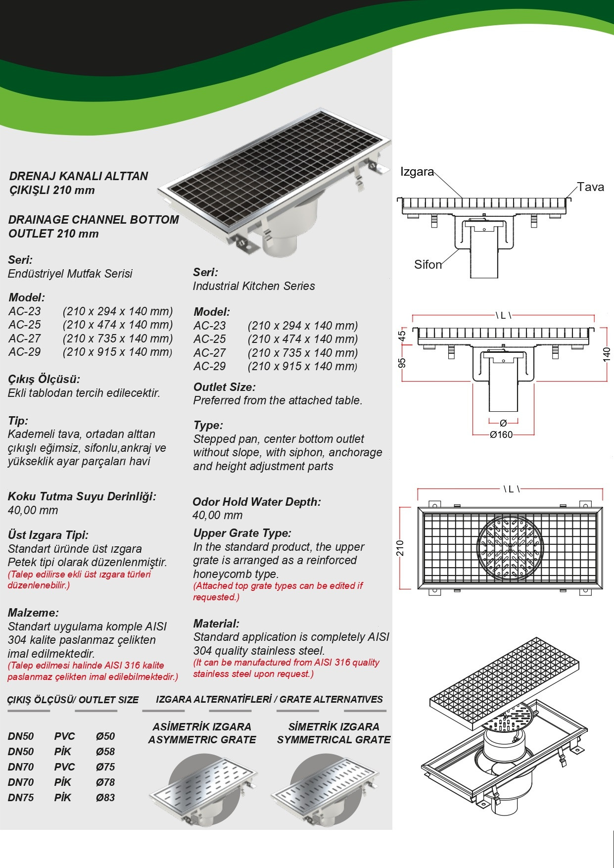 Paslanmaz Çelik Eğimsiz Drenaj Kanalı Alttan Çıkışlı 210’luk ürünümüz standart olarak AISI304 kalite sacdan imal edilmektedir. (Talep edilmesi halinde AISI316 kalite sacdan imal edilebilir.)